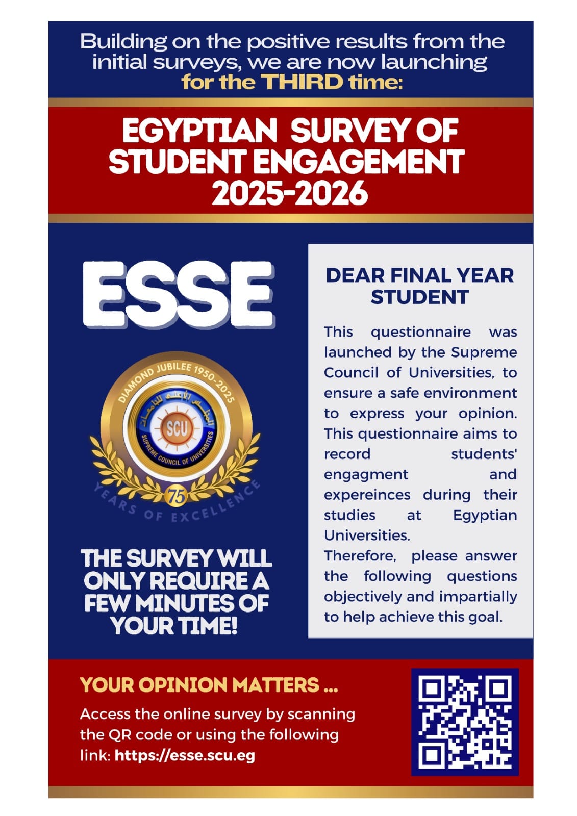 This survey was launched by the Supreme Council of Universities to ensure a safe environment for expressing your opinion. It aims to measure student engagement during their studies at Egyptian universities. Therefore, please answer the following questions objectively and impartially to help achieve this goal.
